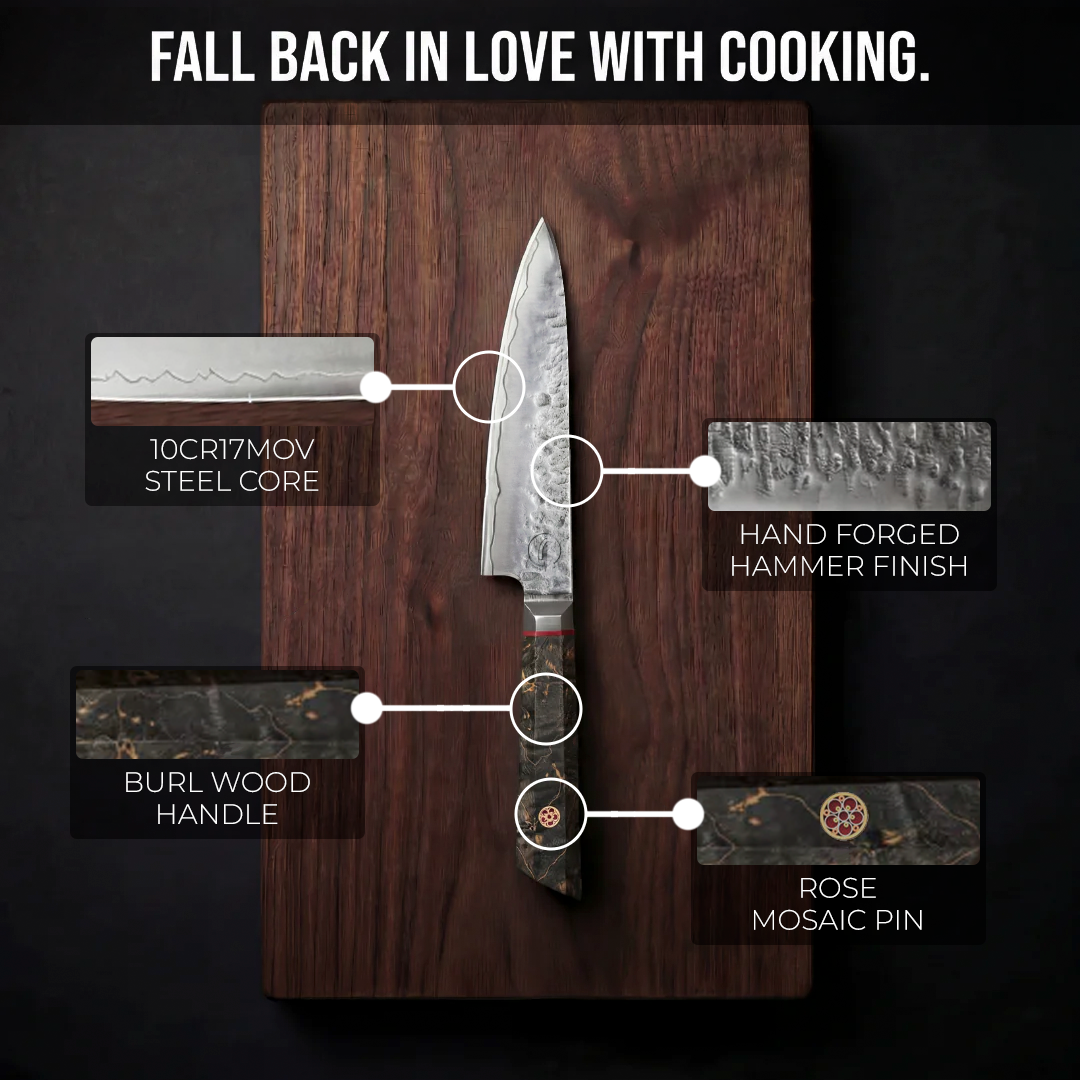 Your precision blade for the finer details. The 6 inch utility knife is perfect for trimming, slicing and smaller prep tasks where control matters most. Hand forged with layered steel and a 10Cr17MoV core, it offers sharpness you can rely on day after day. Finished with a stabilized burl wood handle and signature rose mosaic pin, it brings both performance and style to your kitchen.