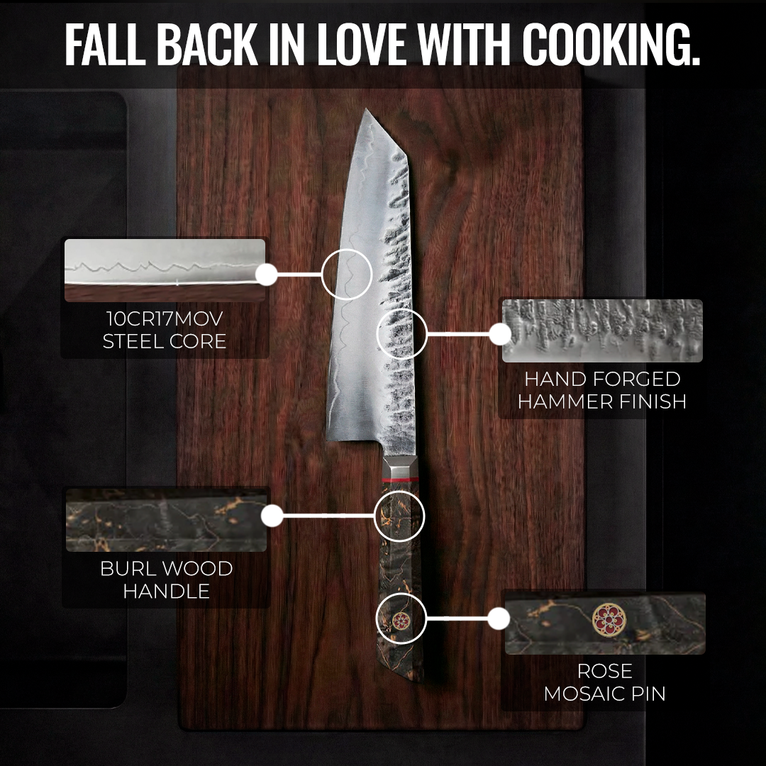 The blade for those who demand precision. The 9" kiritsuke combines the length of a slicer with the control of a fine tip, giving you complete command over every cut. The razor sharp K-tip allows for detailed work, while the long edge glides effortlessly through meat, fish and vegetables. Hand forged from layered steel with a 10Cr17MoV core, it holds a sharp edge you can rely on. Finished with a stabilized burl wood handle and signature rose mosaic pin, this is a statement blade built for performance and presence.