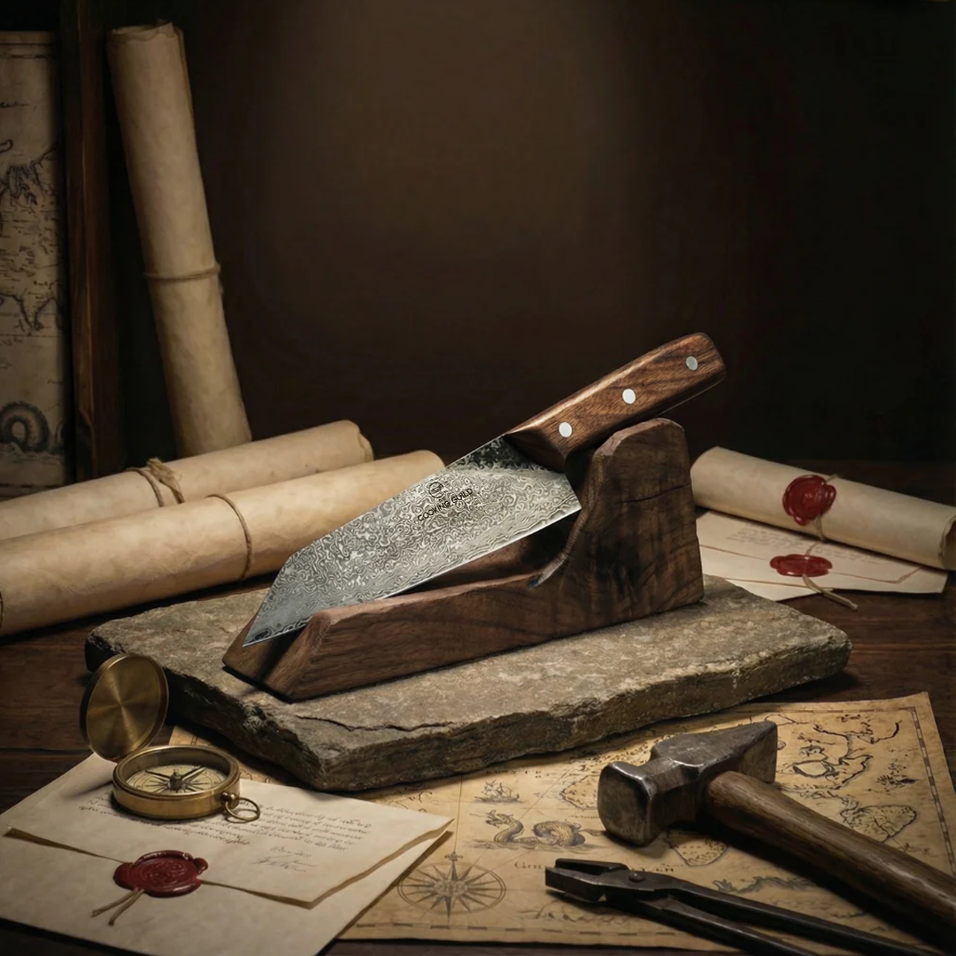 We use only premium steels imported from Japan in most of our collections, including high carbon and Damascus steel. These materials are chosen for their exceptional sharpness, edge retention, and strength. Our handles are crafted from durable pakkawood or epoxy resin, offering both comfort and long lasting performance. Each knife is built with a full tang construction, ensuring perfect balance and stability in every cut. These are not mass produced knives. They are crafted to last and perform.