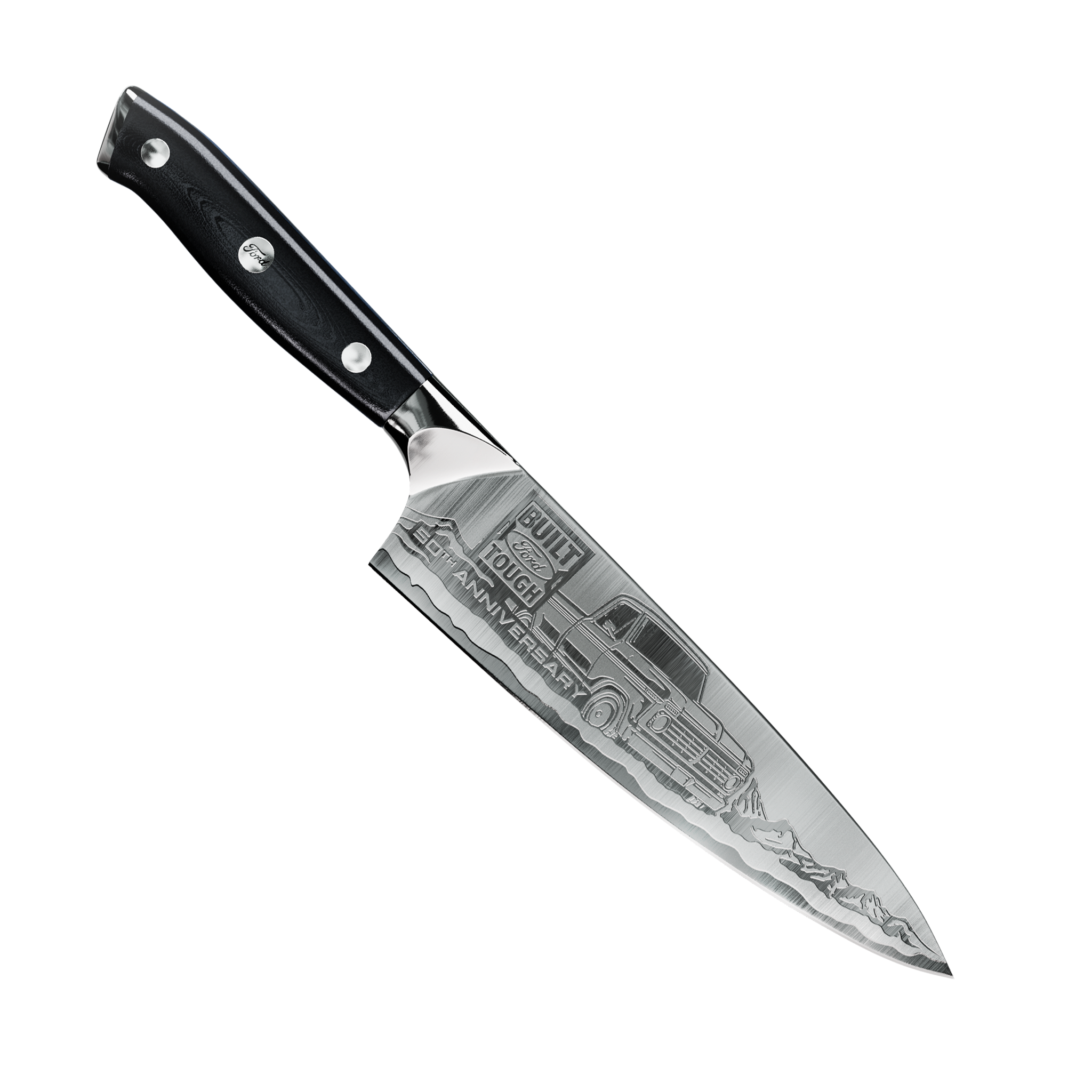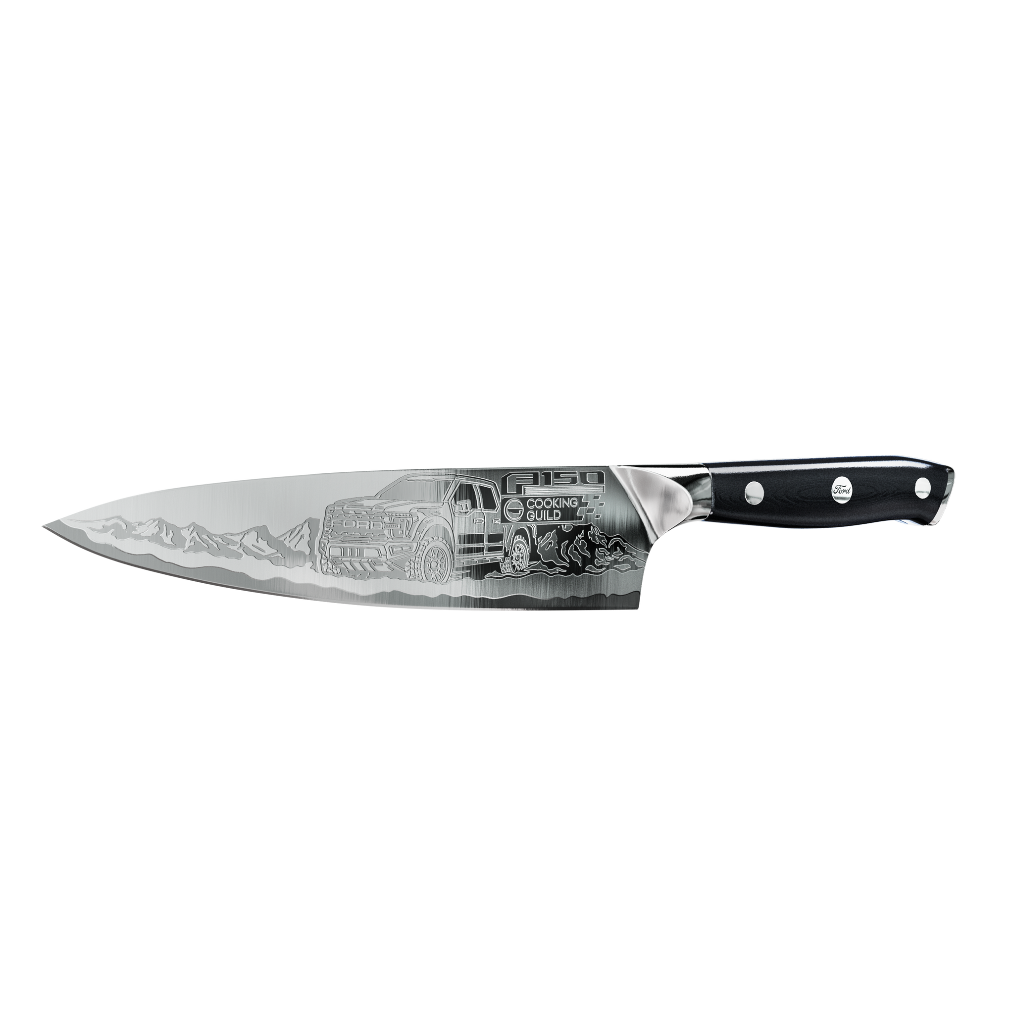 Created in collaboration between Ford Motor Company and The Cooking Guild, the 8" Ford F-150 50th Anniversary Chef Knife marks a historic first as part of Ford’s inaugural culinary knife range. Designed to honor 50 years of the iconic F-150, this blade translates the truck’s legacy of strength, reliability, and performance into the kitchen. Forged with an American S35VN steel core in a three-layer blade construction and finished with a military-grade G10 handle, it is built not only to look exceptional, but to perform relentlessly for generations. This is a true collector’s piece that remains fully capable of daily use.