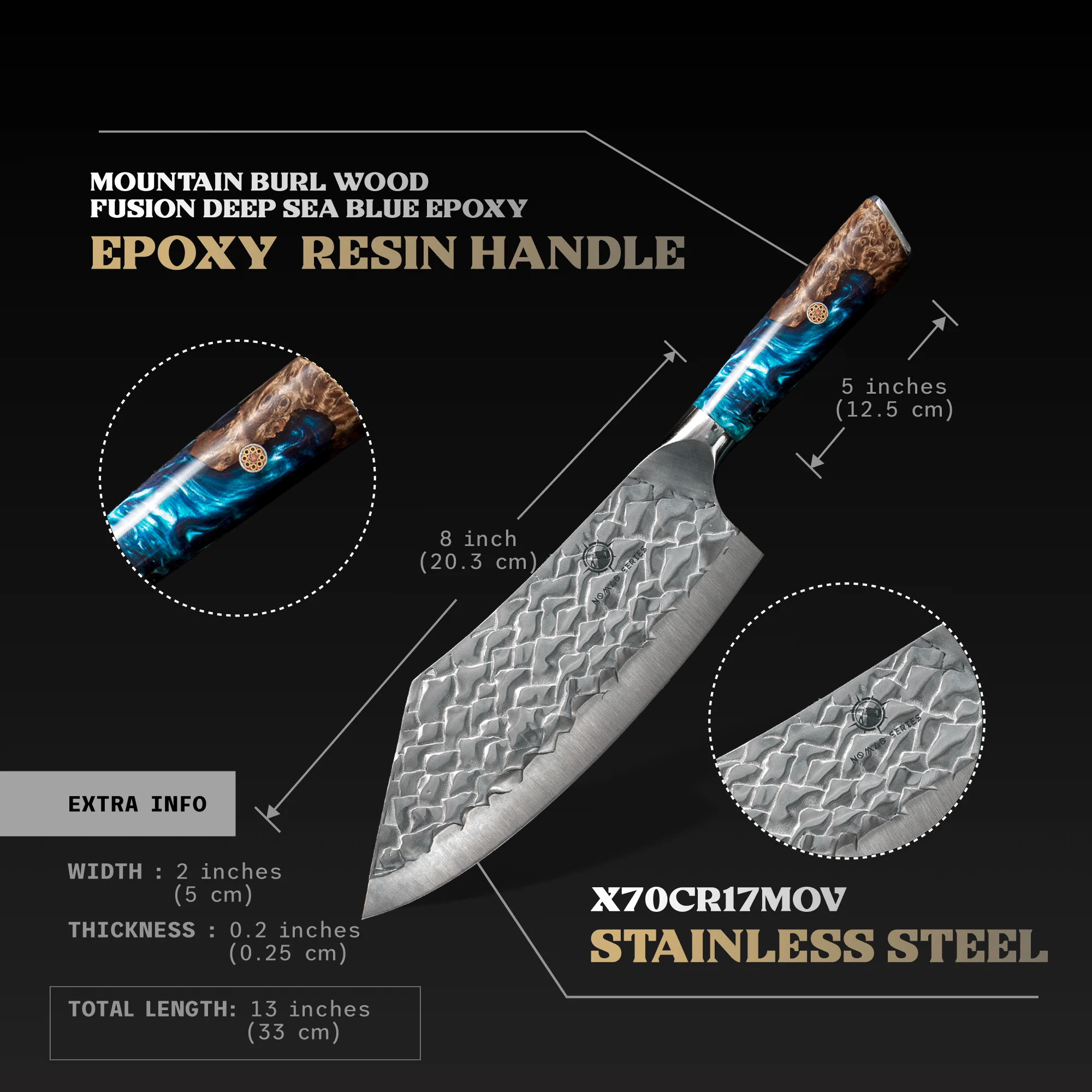 We use only premium steels imported from Japan in most of our collections, including high carbon and Damascus steel. These materials are chosen for their exceptional sharpness, edge retention, and strength. Our handles are crafted from durable pakkawood or epoxy resin, offering both comfort and long lasting performance. Each knife is built with a full tang construction, ensuring perfect balance and stability in every cut. These are not mass produced knives. They are crafted to last and perform.