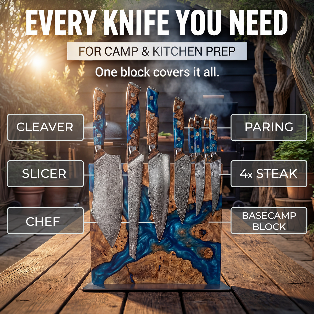 From everyday prep to special occasion meals, each blade delivers incredible sharpness, strength, and balance. The steak knives bring restaurant level precision to your table, while the chef, slicer, and paring knife handle every task with ease. The Base Camp magnetic block keeps the complete set on display, ready to use and easy to access.