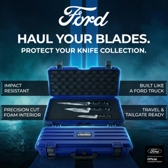 Three essential blades built to tackle the kitchen, the BBQ, and tailgating cooks alike—packed in a rugged hauler that’s ideal for Ford fans and collectors.