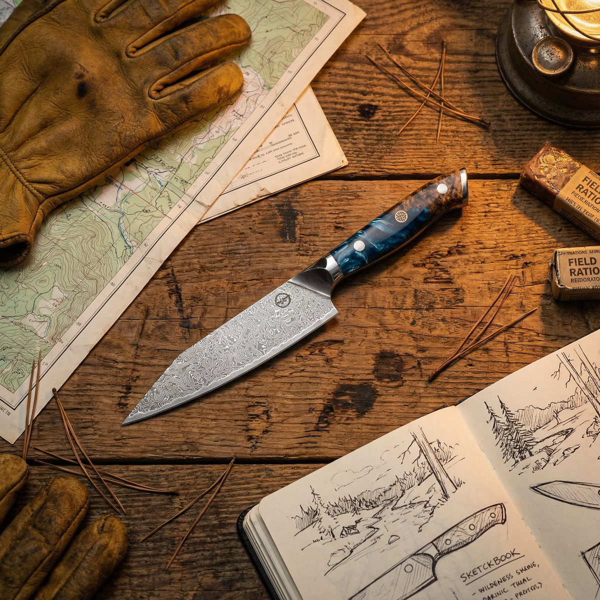 The Nomad Damascus Edition brings the perfect blend of performance and artistry. The deep, swirling patterns rippled across the blade showcase centuries-old forging traditions while the ergonomic resin-and-burl handle provides comfort, control, and undeniable style. Whether preparing a weeknight meal or hosting a special occasion, this blade transforms every task into a moment worth savoring.