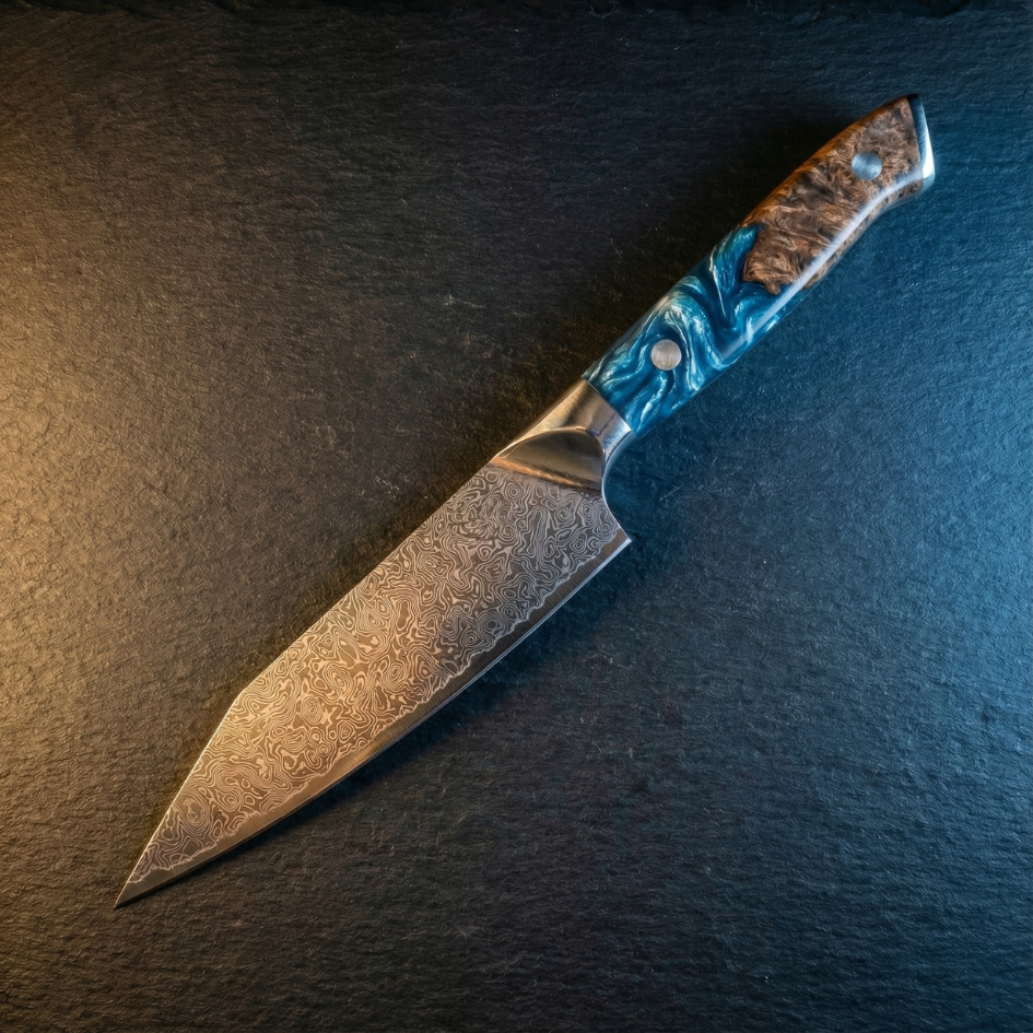 We use only premium steels imported from Japan in most of our collections, including high carbon and Damascus steel. These materials are chosen for their exceptional sharpness, edge retention, and strength. Our handles are crafted from durable pakkawood or epoxy resin, offering both comfort and long lasting performance. Each knife is built with a full tang construction, ensuring perfect balance and stability in every cut. These are not mass produced knives. They are crafted to last and perform.