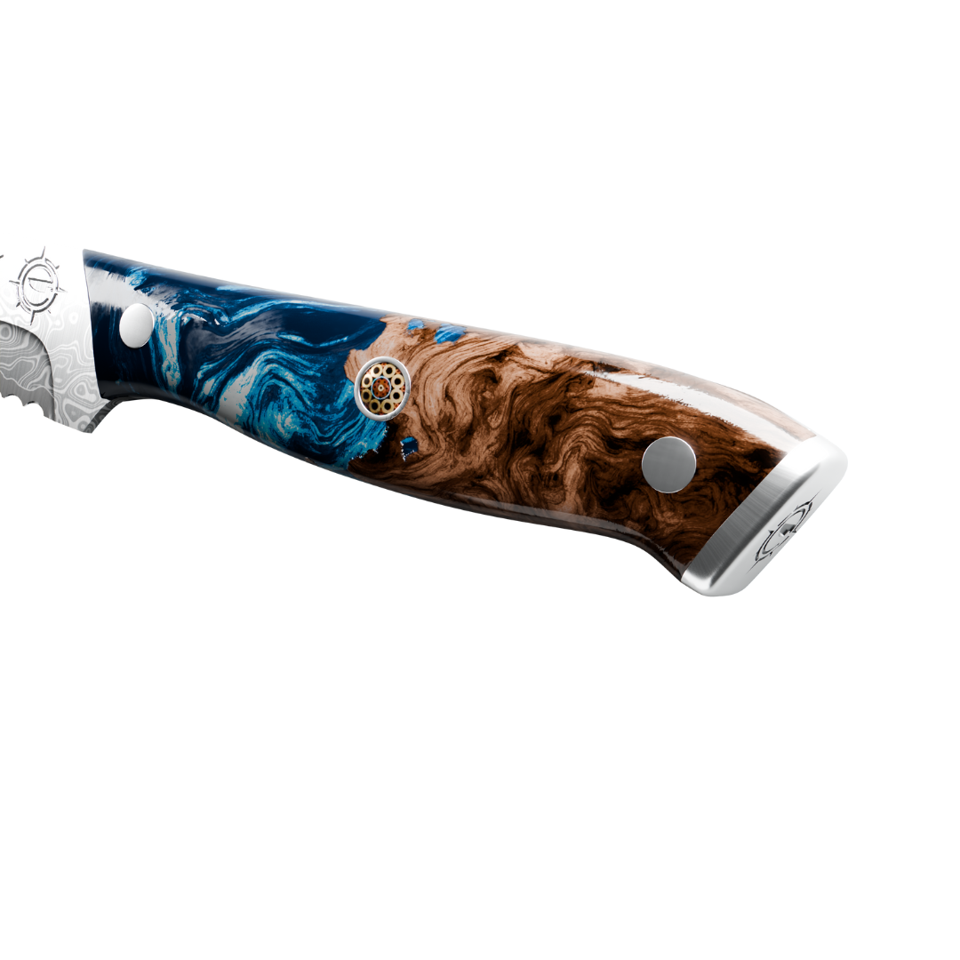 We use only premium steels imported from Japan in most of our collections, including high carbon and Damascus steel. These materials are chosen for their exceptional sharpness, edge retention, and strength. Our handles are crafted from durable pakkawood or epoxy resin, offering both comfort and long lasting performance. Each knife is built with a full tang construction, ensuring perfect balance and stability in every cut. These are not mass produced knives. They are crafted to last and perform.