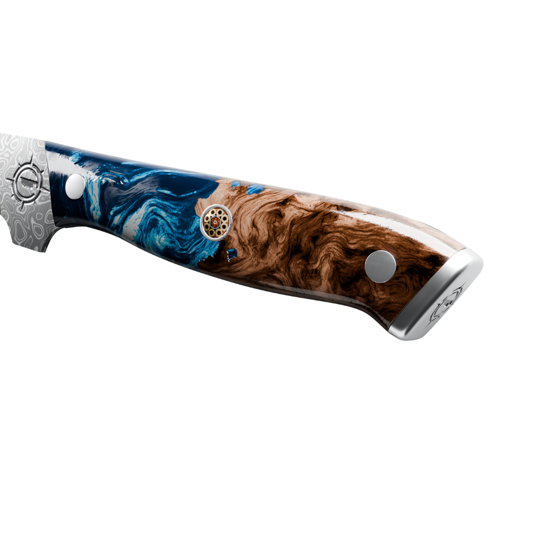 We use only premium steels imported from Japan in most of our collections, including high carbon and Damascus steel. These materials are chosen for their exceptional sharpness, edge retention, and strength. Our handles are crafted from durable pakkawood or epoxy resin, offering both comfort and long lasting performance. Each knife is built with a full tang construction, ensuring perfect balance and stability in every cut. These are not mass produced knives. They are crafted to last and perform.