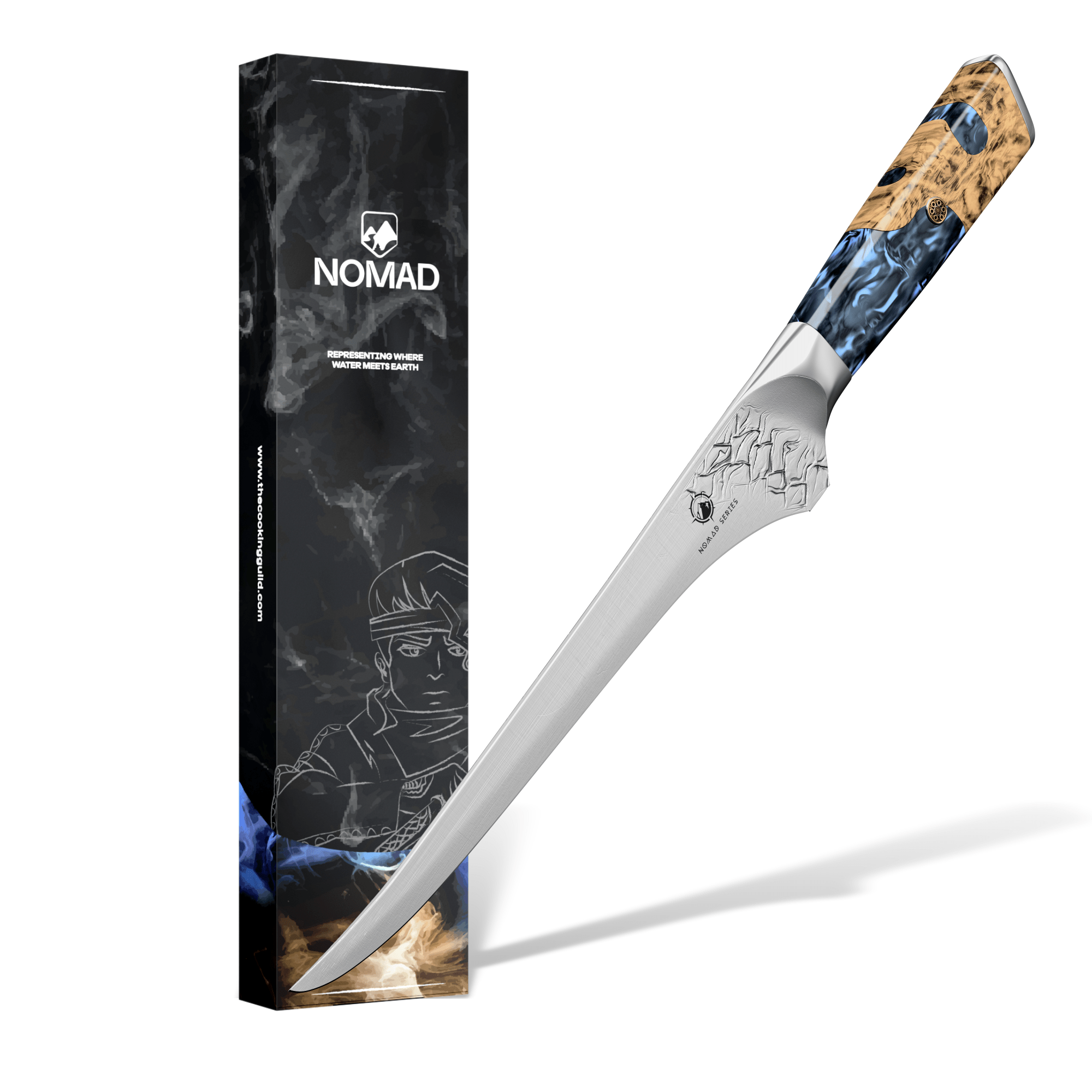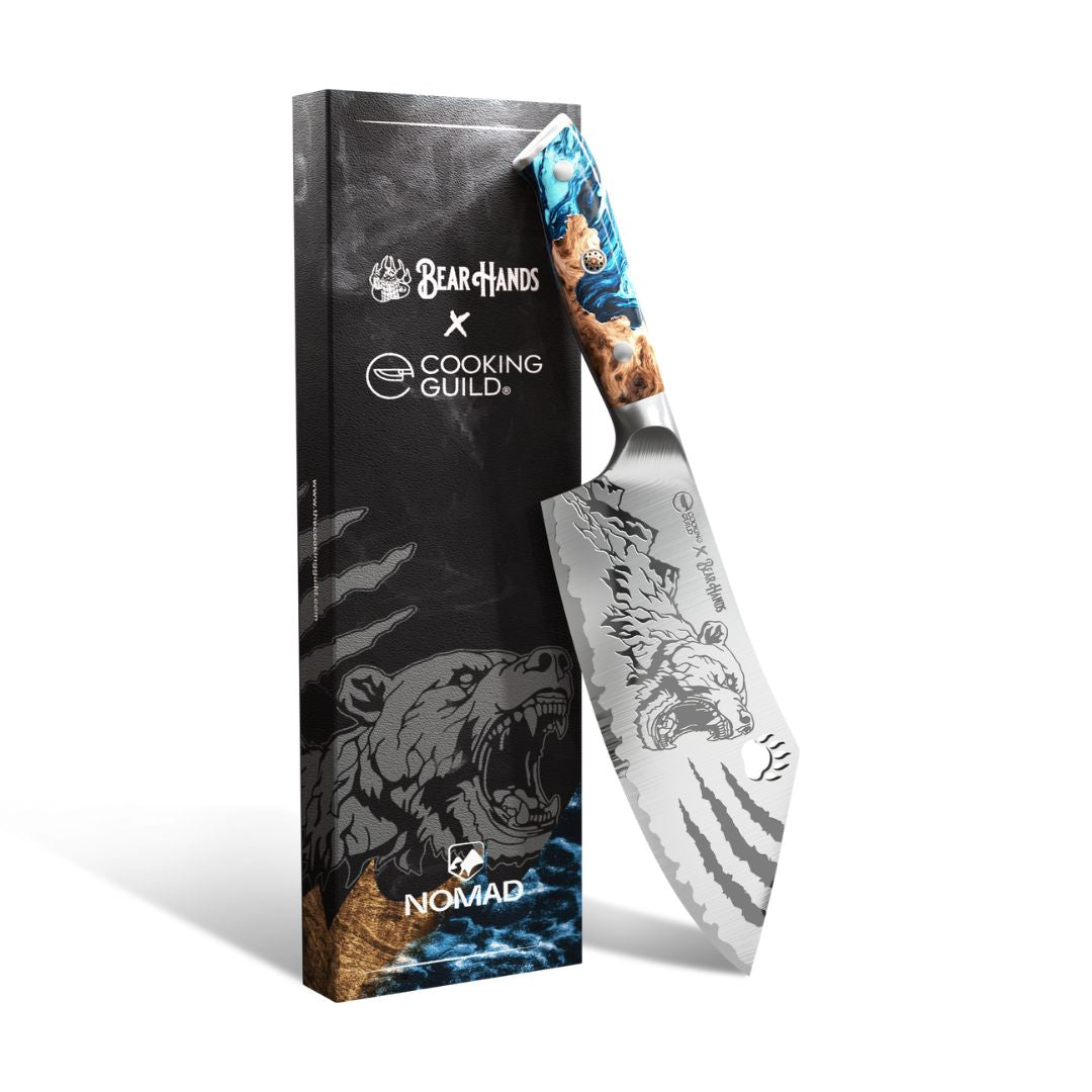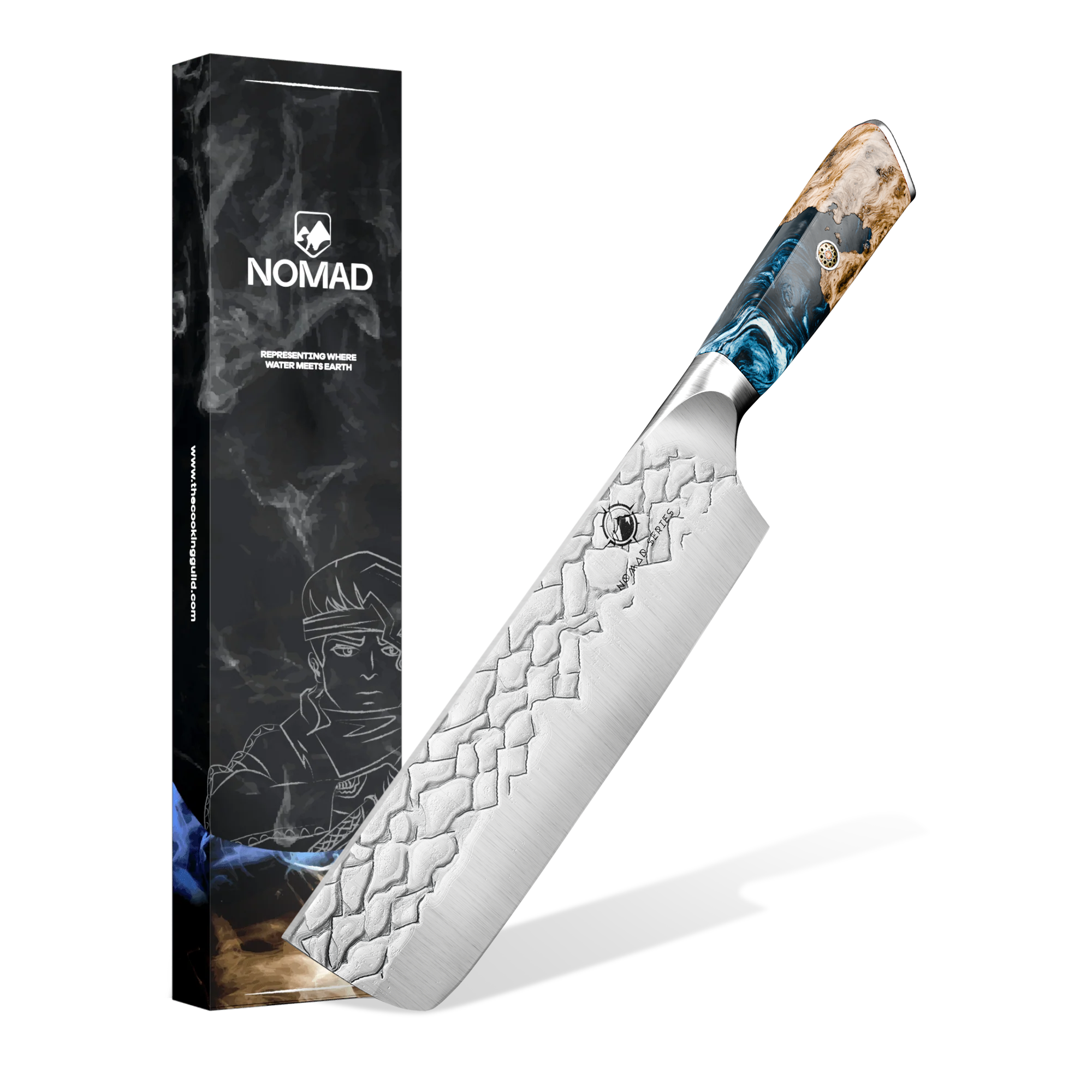 The Mountain Burl wood fusion handle gives this knife a unique look that is inspired by the great outdoors, while the deep sea blue epoxy resin provides a pop of color that is sure to stand out in your kitchen.