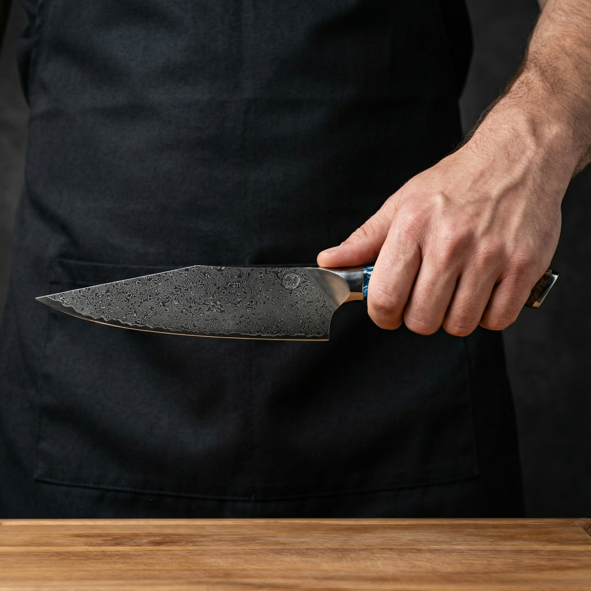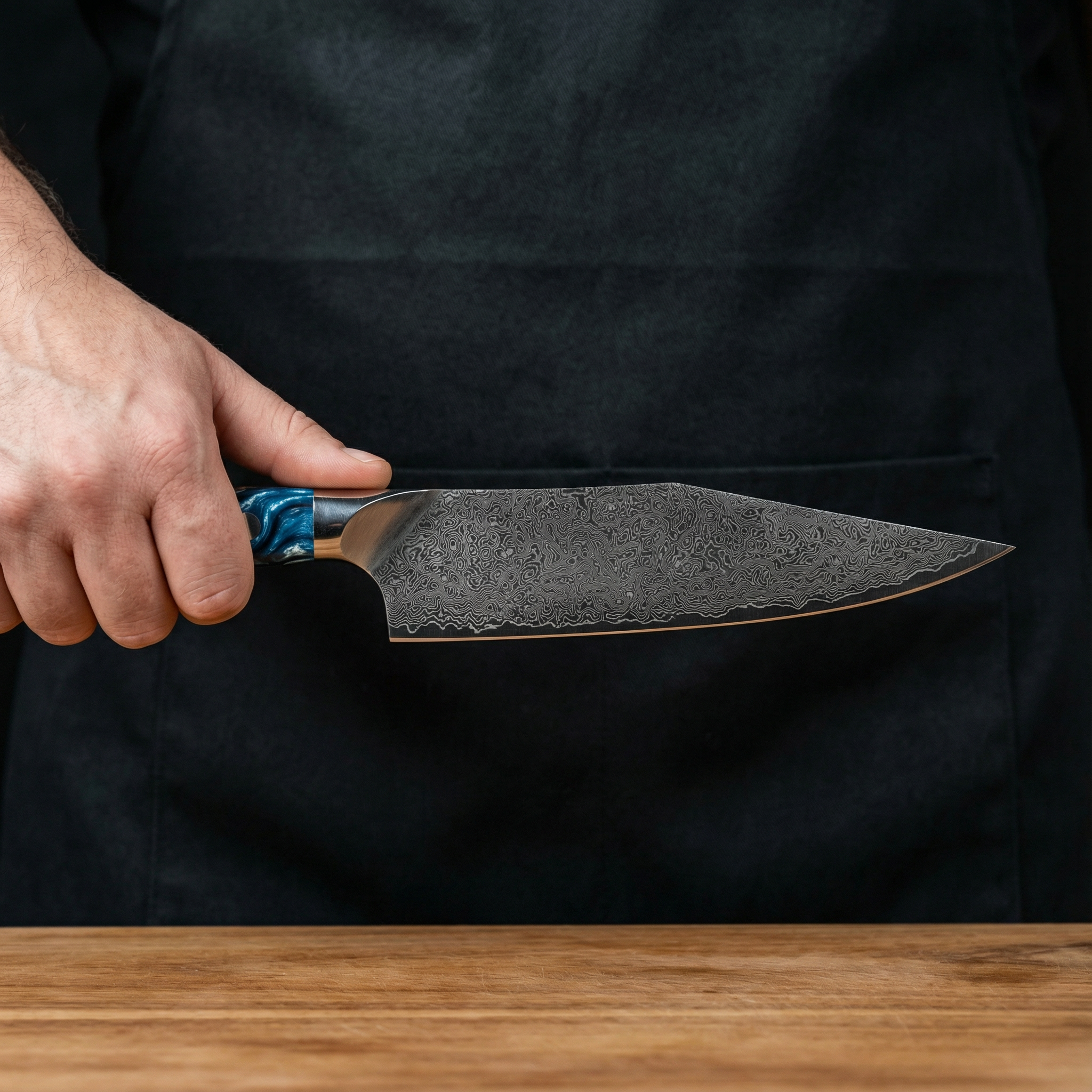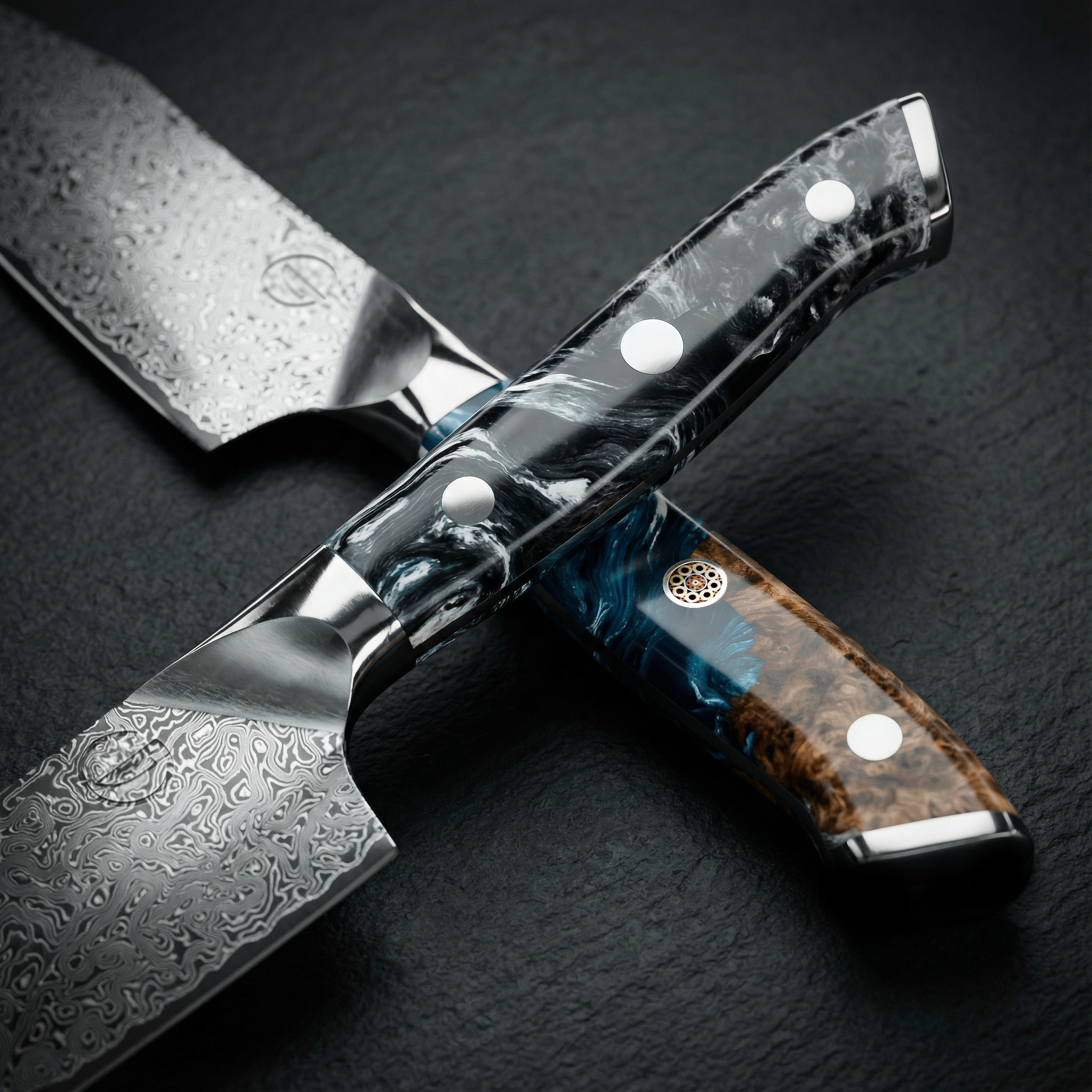 We use only premium steels imported from Japan in most of our collections, including high carbon and Damascus steel. These materials are chosen for their exceptional sharpness, edge retention, and strength. Our handles are crafted from durable pakkawood or epoxy resin, offering both comfort and long lasting performance. Each knife is built with a full tang construction, ensuring perfect balance and stability in every cut. These are not mass produced knives. They are crafted to last and perform.